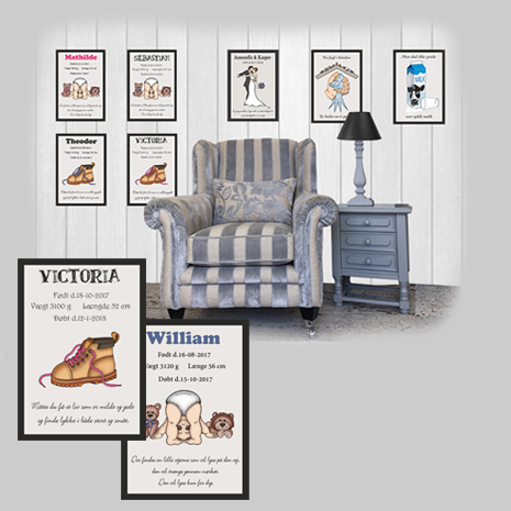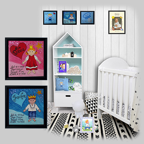 Håndmalet malerier, plakater, rammer med passepartout, alle med personlige dataer : navn, fødselsdag, vægt, længde, dåb eller stjernetegn.
